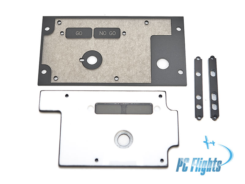 Panel includes black screws (not DZUS) which connect first and second layers. As on real F 14 flight cockpit parts and panels our upper layer outer edges and rectangular annunciator cutouts are finished on routing machine and have rounded edges, as well as all round openings (for buttons, switches, etc.) have hidden recesses to mask switch/button mounting nuts and washers. |