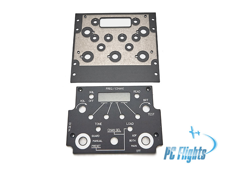 This is flight simulator replica of F 14 "Tomcat" UHF 1 Radio Control panel - home cockpit system. It consists of two layers and is ready for backlight. Both layers were cut on CNC routing and precision laser machines and painted with two layers of durable industrial grade RAL-9005 (Jet Black) paint. Indicator window has smoky glass which hides inactive 7-segment indicators, but clearly shows active. |